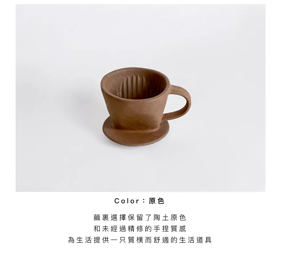 手工製作的扇形濾杯,保留陶土原色和未經過精修的手捏質感,由尼泊爾公平貿易組織製作,為生活提供一只質樸而舒適的生活道具。 Color:原色 保留了陶土原色和未經過精修的手捏質感,為生活提供一只質樸而舒適的感覺。 濾杯口直徑:9.5-10cm 濾杯底直徑:9.5-10cm 濾杯高度:8cm 適用杯數:1-2人份 材質:100% 陶 手工製作,尺寸和形狀存在些微差異,此為正常現象,謝謝您的理解與體諒。 使用保養: 適用平口扇型濾紙,請選擇對應沖泡杯數的濾紙,將研磨咖啡粉倒入濾紙中,再將濾紙放置濾杯上沖泡使用。 請勿長時間盛裝液體或浸泡水中,陶器可能因此受潮發霉。 使用後手洗或使用海綿清潔,勿使用鋼刷,洗淨後擦拭晾乾即可。 產地:尼泊爾 About the makers: 尼泊爾公平貿易生產組織:Sana Hastakala Sana Hastakala在尼泊爾文中的意思為“小型手工藝”,象徵著組織傳承尼泊爾傳統工藝的決心,SH的生產者80%為婦女,組織提供完整的技術訓練和產品銷售,團隊努力增加出口外銷以幫助弱勢的生產者得以提升經濟和生活狀況。 其銷售的盈利則用於生產者的職業訓練,員工福利,組織加強建設上。 謝謝您!選擇公平貿易,幫助他們重返笑容和自由。